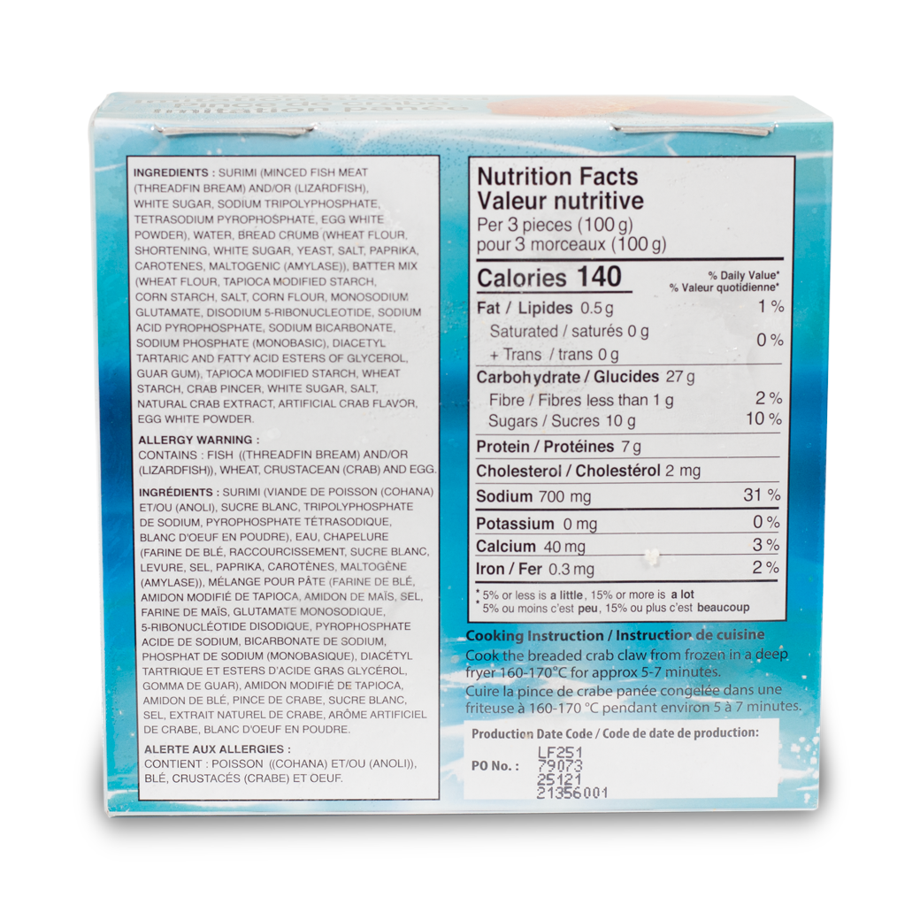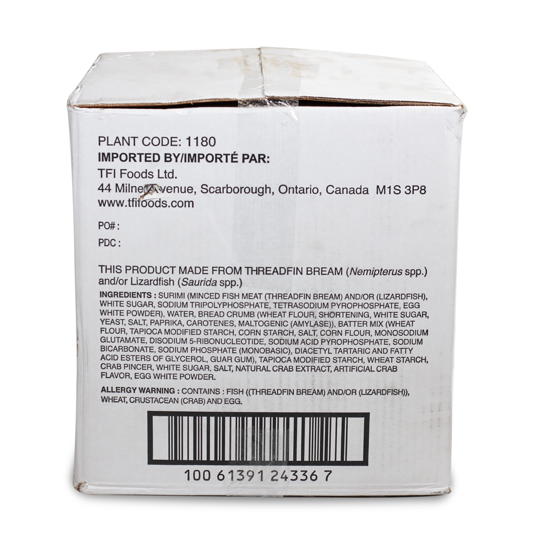 Ingredients: Surimi, White sugar, sodium Tripolyphosphate, Water, Bread Crumb...