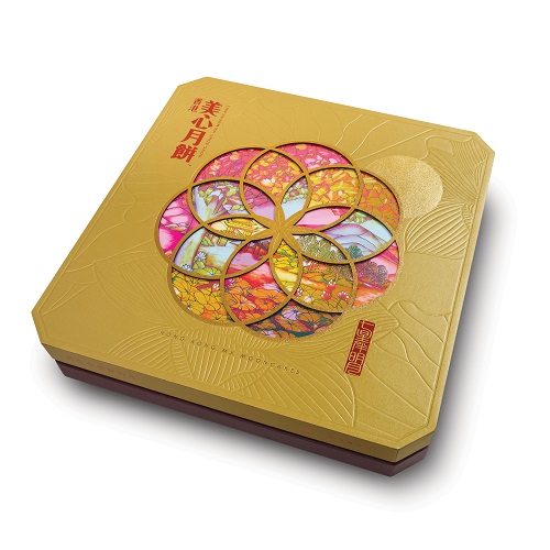 The gift box design is noble and decent Lined with elegant embossed patterns, seven rings are used to embrace colorful lotus ponds with a shining moon, in recognition of the mood "seven stars accompanying the moon“ Inside the giftbox seven star mooncake are accompanied by a full moon 3 Egg Yolks White Lotus Seed Paste” No coloring and preservative is added for all mooncake